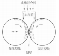 對(duì)輥壓球機(jī)是發(fā)展較早、應(yīng)用多的壓團(tuán)法設(shè)備,因其對(duì)原料粒度要求低、成球質(zhì)量高、可用有機(jī)粘結(jié)劑,且有機(jī)粘結(jié)劑在燃燒過(guò)程中可以提供部分熱量, 燃燒產(chǎn)物少,不會(huì)影響到直接還原后產(chǎn)品品質(zhì),對(duì)輥壓球機(jī)是轉(zhuǎn)底爐工藝中普遍應(yīng)用的原料成球設(shè)備。