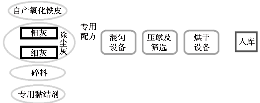 通過提高氧化鐵皮含量提高壓球含鐵量。設(shè)計配比試驗,在不影響成球率的基礎(chǔ)上,改變粗細氧化鐵皮配比,可以穩(wěn)定壓球含鐵量。調(diào)整烘烤時間、物料分層烘烤以提高日產(chǎn)量,降低壓球含水量,提高壓球強度。黏結(jié)劑中可含部分增加冷固球團強度、阻止黏結(jié)劑氧化且對鋼水成分不造成影響的無機物。工藝路線圖如下: